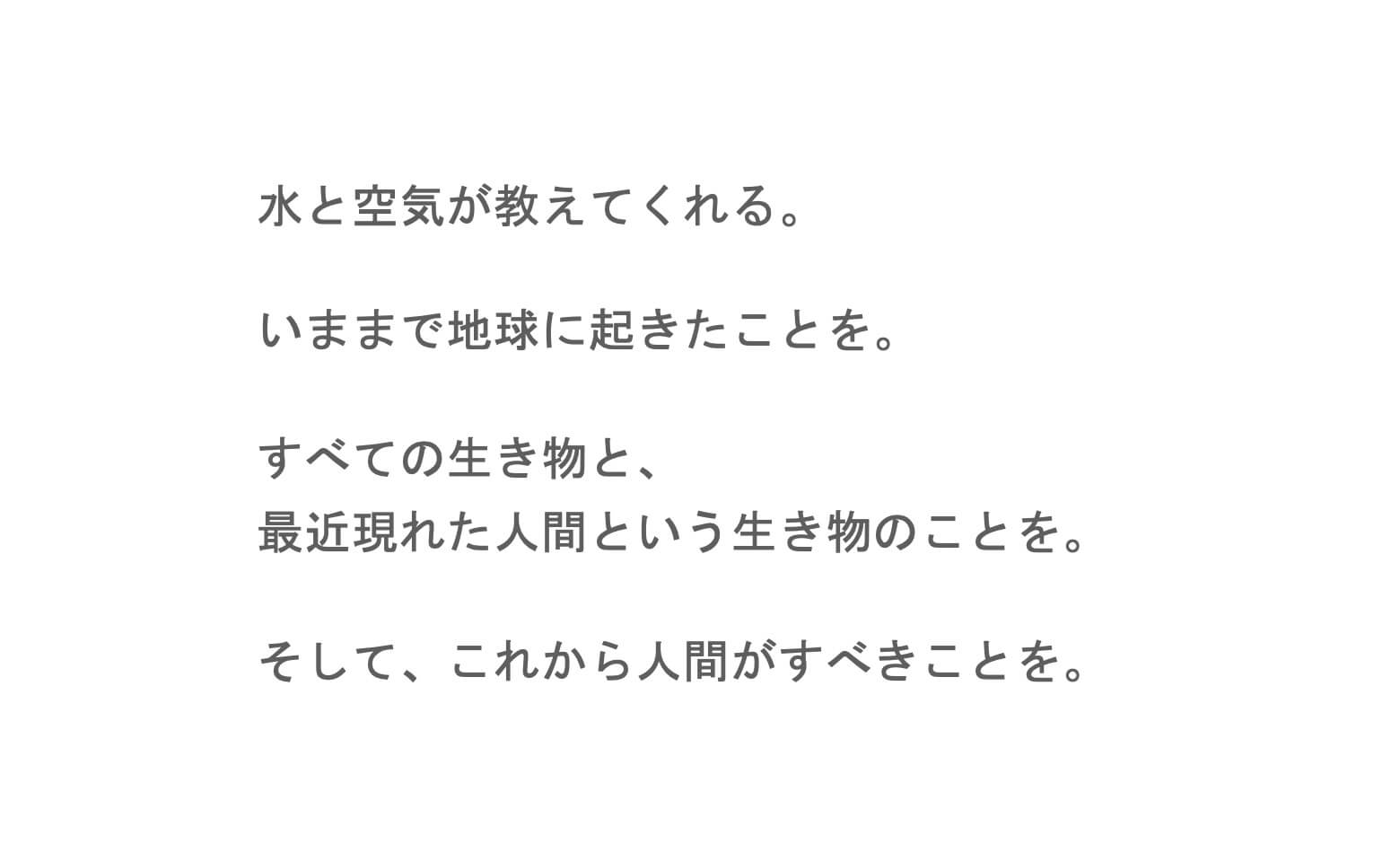 これまでさまざまなクリエイティブに携わってきましたが、水も空気もものすごく面白い題材だと思います。なぜなら、人の心を動かそうとする時に何かのモチーフを利用しながら伝えるわけですが、すべての生きものに関わる水や空気は、多くの人が共感できるモチーフとしてサイズがものすごく大きいからです。