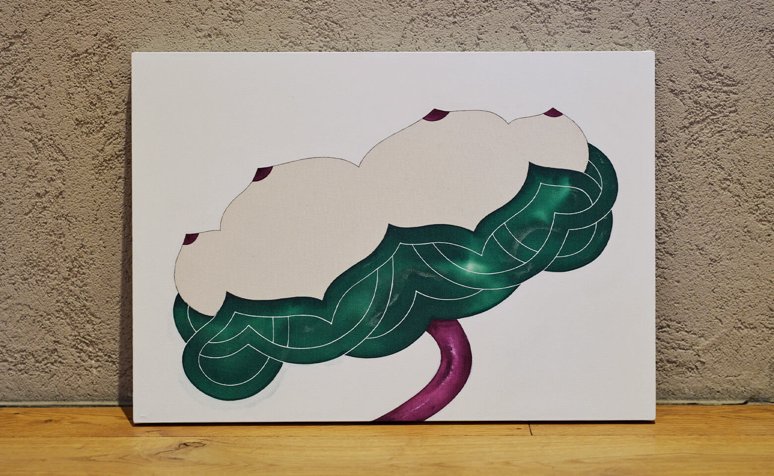 私は今、「サンカラー」という染料とアクリルガッシュの2種類の画材を併用して作品を描いています。 このスタイルで描くようになったのは、大学の卒業制作で着物を制作した際、工芸科の先生に扱いやすい染料を教えていただいたことがきっかけです。「サンカラー」は布の繊維にスッと入り込み、にじみのある繊細な色彩を生み出します。一方で、アクリルガッシュはエッジの効いた硬質な表現が可能です。正反対の性質を持つ画材を合わせることで、互いにいい影響を与え合うことを発見したのです。