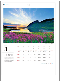 2017年版ダイキンお天気カレンダーでは、「AIR−感じる空気−」をテーマに、移ろいゆく自然の一瞬の空気感を捉える写真家・谷角靖氏の作品から厳選した写真で構成しています。写真の空気感をより身近に感じてもらうために、谷角氏が撮影した場所で感じた温度・湿度等の“空気の情報”を文章や図で紹介する工夫を加え、かけがえのない一瞬の空気感を表現した世界中の風景写真を通じて、ダイキンの理想とする“高品質な空気”を表現しました。
