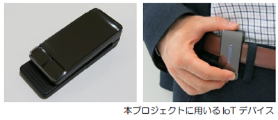本プロジェクトでは、クリップ状のIoTデバイスをベルトに装着し、多様な職場で働くモニターの身体活動情報、心拍情報、ストレス度、睡眠情報などの生体情報をリアルタイムに計測します。計測した情報をクラウドに蓄積し分析することで、職場環境とストレス度の相関や、就業時のストレス度と就寝時の睡眠状態の相関などを明らかにします。