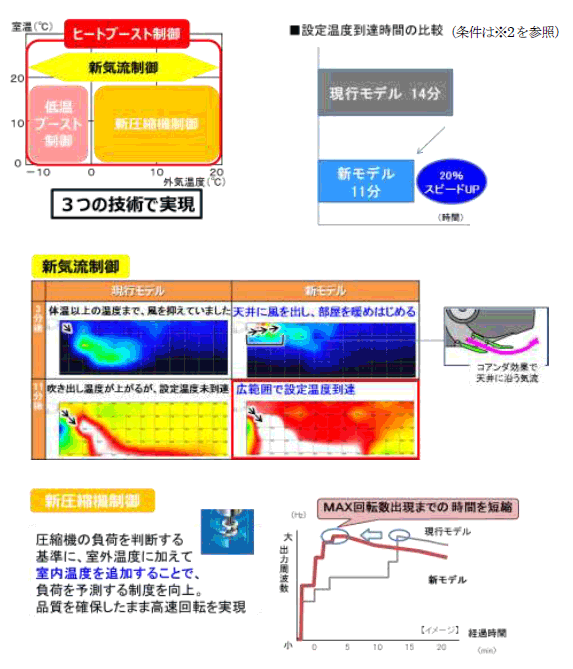 本商品は、快適性を向上させる各機能の効果を、エアコンの運転開始後にいち早く発揮させるため、冷媒を加熱、冷却する圧縮機の性能を従来以上に引き出す新たな制御を組み込みました。暖房時の「ヒートブースト」制御では、設定温度への到達時間を約20%短縮します。冷房時の「クールブースト」制御では、夏場の不快感の要因となる湿気を素早く除去します。