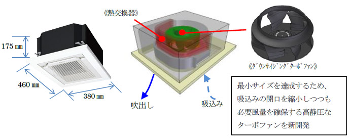 『ココタス』は、小部屋にも設置しやすいよう天井埋込カセット形を採用し、部品や構造を根本から見直す事で業界最小寸法を実現しました。