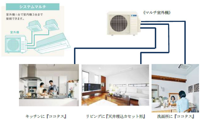 1台の室外機に複数の室内機を接続できる住宅用マルチエアコンに『ココタス』を品揃えしました。各小部屋に『ココタス』を複数選ぶ組み合わせや、床暖房ユニットや壁埋込形の室内機と組み合わせた接続も可能とし、お客様のライフスタイルに応えることができます。