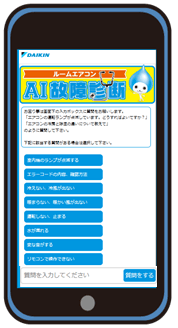 第一弾として、夏場や冬場に最もお問い合わせの多い家庭用ルームエアコンの故障診断サービスを開始します。「運転しない」「冷えない」などのエアコンの不具合の症状について、画面上に表示する質問にユーザーが答えていくことで、故障の診断結果がわかります。サービスエンジニアの訪問が必要と診断された場合は、修理料金の目安が提示され、そのまま修理の申し込みをすることも可能です。