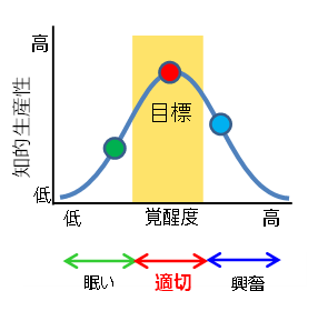 知的生産性を高めるには、眠気をおさえて覚醒度を適切に保つことが重要だと言われています(図1:Yerkes-Dodsonの法則※2)。今回、覚醒度を適切に保つにはどのような方法・タイミングの刺激がよいかを確かめるため、定期的に被験者の覚醒度を測りながら、空調(温度)・照明(照度)・アロマ(芳香)それぞれの刺激を与え、覚醒度の変化を検証しました。