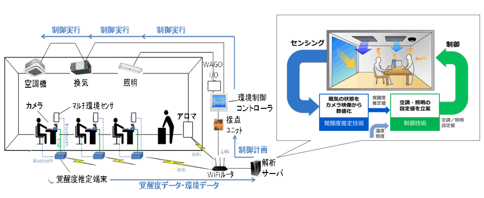 本検証をもとに、まぶたの開度から眠気の兆しを検知して、空調・照明を組み合わせた刺激を与えるプロトタイプの制御システムを構築しました。今月よりダイキン工業(40平米)・NEC(200平米)の検証用オフィスにて、執務中の覚醒度データを取得して空調・照明の環境制御を行うフィールド実験を開始しています。