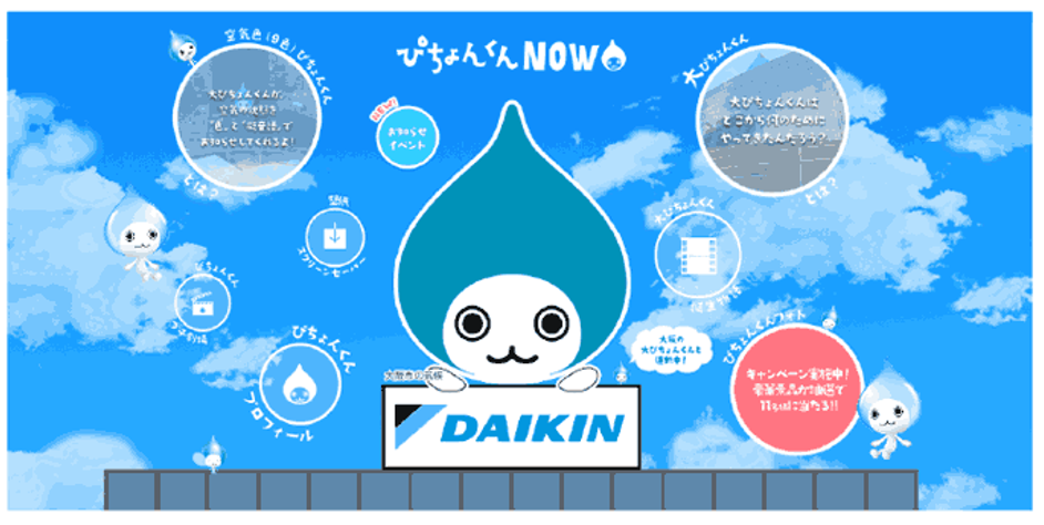 看板連動ウェブサイト「ぴちょんくんNOW」(http://pichonkun.jp/)では、大阪・梅田に設置されている「大ぴちょんくん」と連動し、ウェブサイト上でも常に実物の看板と同じ情報を表示しています。ほかにもぴちょんくんコンテンツが満載のページになっています。
