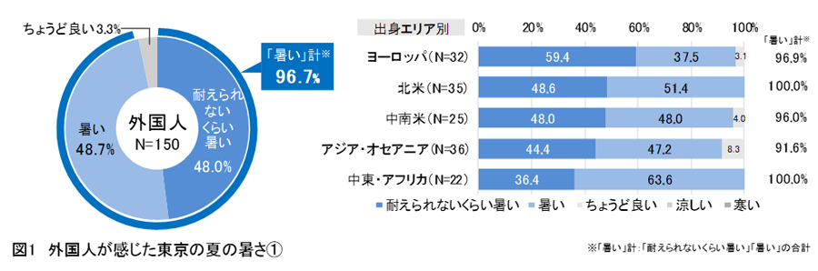今年は酷暑の夏となりましたが、外国人は東京の夏の暑さについてどう感じているのでしょうか。「あなたは東京の夏(屋外)の暑さをどう感じますか」と聞いたところ、ほぼ全員(96.7%)が「暑い」と回答しました(図1)。また、約半数(48.0%)は「耐えられないくらい暑い」とまで感じているようです。