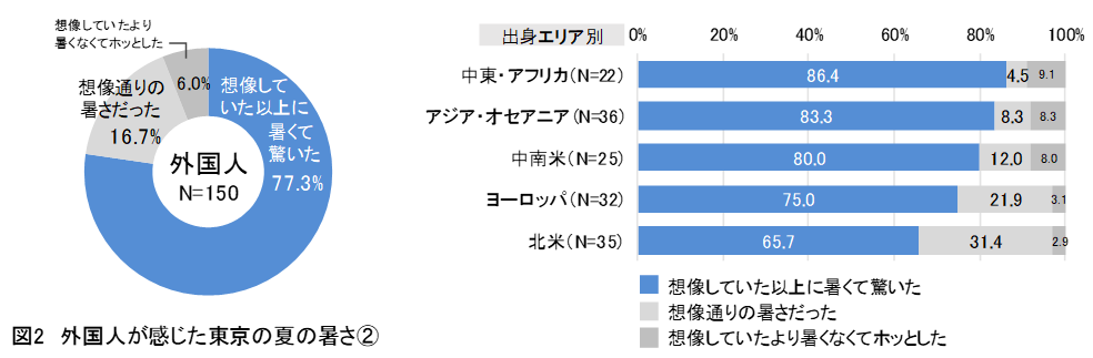来日前に東京の夏の暑さについて何らかの予備知識を持っていた人は約6割(56.7%)に留まりました。東京の暑さは来日前の想像を超えるレベルだったようで、約8割(77.3%)が「想像していた以上に暑くて驚いた」と回答しています(図2)。アジア・オセアニア、中東・アフリカ出身の外国人の回答結果を見ると、東京の夏は「耐えられないくらい暑い」と回答した人は相対的に少なく、出身国の暑さも厳しいことが伺えますが、「想像していた以上に暑くて驚いた」と回答した人は多くいました。来日前に東京の暑さのことを少しでも知っていれば、持ち物の準備や旅行の計画をする際に役立つこともあるはずです。今後、来日を検討している外国人に向けて東京の夏の暑さについて情報発信することがますます重要になるでしょう。