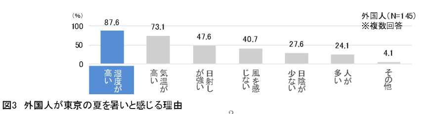 外国人が東京の夏を暑いと感じるのはなぜでしょうか。「あなたが東京の夏(屋外)を暑いと感じる理由はなんですか」と聞いたところ、約9割(87.6%)が「湿度が高い」と回答(図3)。「気温が高い」を抑えて最も多くなりました。