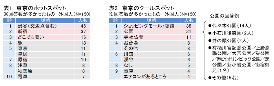 外国人にとって、東京の夏の暑さを象徴するホットスポットはどこなのでしょうか。「あなたが夏に東京都内で暑いと感じる場所はどこですか」(自由記述式回答)と東京のホットスポットを聞いたところ、最も多かったのが「渋谷」で、以下「新宿」「どこでも暑い」が続きました(表1)。反対に「あなたが夏に東京都内で涼しさを感じる場所はどこですか」(自由記述式回答)と聞いたところ、最も多かったのは「ショッピングモール・店舗」で、以下「公園」「寺社仏閣」が続きました(表2)。P.6の田中先生からのアドバイスにもある通り、長時間屋外にいて体調を崩しそうなときは、屋内のエアコンが効いた「ショッピングモール・店舗」などで体を休めることも有効です。