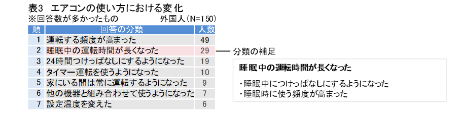 日本人にとって、夏のエアコンは必需品といえる存在ですが、外国の方にとっても同じ位置付けなのでしょうか。そこで、「あなたが東京の夏を経験してから、エアコンの使い方にどのような変化があったか教えてください」(自由記述式回答)と聞いたところ、 最も多かったのが「使用頻度が増えた」(49人)でした(表3)。さらに、エアコンを「つけっぱなし」にするようになったという人も19人存在しています。外国人にとっても東京の夏にエアコンは必需品という位置付けになっているようです。
