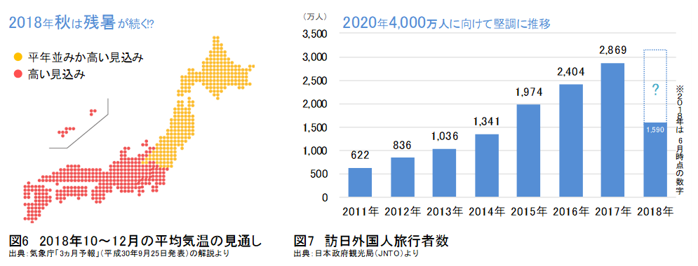 一方で、日本を訪れる外国人旅行者は、昨年(2017年)まで5年連続で過去最高を更新し、2018年は、6月の時点で前年よりも1ヵ月早く1,500万人を超えるペースで推移しています(図7)。過去最高の3,000万人の大台突破の可能性もあるなど、政府が掲げる2020年に4,000万人という目標の達成も見えてきました。