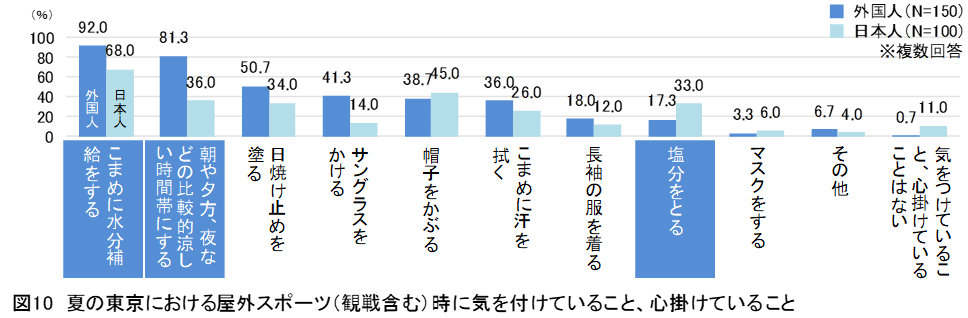 それでは、湿度の高い東京の夏にスポーツをする時(観戦含む)に、外国人はどのようなことに気を付けているのでしょうか。「あなたが夏の東京の屋外で快適にスポーツをしたり観戦したりするために、気を付けていること、心掛けていることはありますか」と聞いたところ、最も多かったのが「こまめに水分補給をする」(92.0%)で、以下「朝や夕方、夜などの比較的涼しい時間帯にする」(81.3%)、「日焼け止めを塗る」(50.7%)が続きます(図10)。なお、回答数上位のこれらの項目は日本人よりも外国人の方が、気をつけていること、心掛けていることとして回答した人の割合が大きく、暑さに対する意識の高さが伺えます。一方で、「塩分をとる」と回答した日本人の割合は、外国人の約2倍でした。横浜国立大学の田中英登先生によると「湿度が高い空気環境では、汗をかいても皮膚から蒸発しにくく体温が下がりにくいため、どうしても発汗量が増えて体内の塩分が不足しやすくなる」とのことで、「塩分をとる」のは湿度が高い環境で生活する日本人ならではの対策と言えそうです。日本には、飴や飲み物など、塩分補給に適した食品が充実しているので、激しい運動をする時などには上手に活用しましょう。