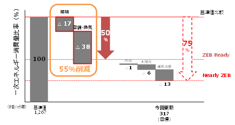 今回、実施の対象としたビルは1997年9月に建てられた2620m2の中規模ビルです。入居者はダイキン工業ならびに関係会社であり、空調の更新にあたり、既に発売されている空調機、換気機器、照明機器のみでZEB Ready化を狙いました。その結果、WEBPRO(エネルギー消費性能計算プログラム 〈非住宅版〉)の試算による一次エネルギー消費量は、照明、空調、換気機器更新のみで基準値と比較して55%削減でき、ZEB Readyを達成しました。更に、更新ではあまり事例のないNearly ZEB※6を目指し、太陽光発電や二重窓を設置し、最大67%の削減を達成しました。