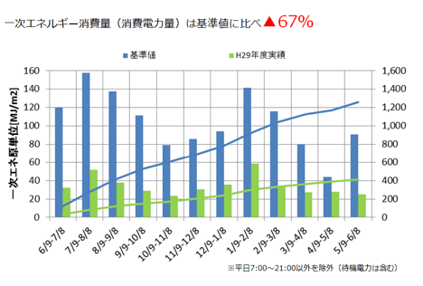グラフは空調更新後の1年間の一次エネルギー消費量の実績を示しています。縦軸は一次エネルギー原単位を示し、棒グラフは国の指定する基準値とH29年度の実績値、折れ線グラフはそれらの積算値を示しています。前述の取り組みに加え、更なる省エネ達成に向け、二重窓、太陽光発電、ZEBモニターを設置して計測をしました。各月、確実に消費電力量が削減でき、1年間では基準値と比べて67%の削減を実現しました。