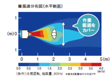 従来のスポットエアコンに比べて量の多い1人当たり毎分15m3の風を吹出します。また、350mmの大口径により人が心地よいと感じる風速と広がりからやわらかい風を吹出します。