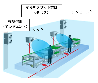 2018年6月に稼働した当社の臨海工場(堺市)では、『マルチキューブエアコン』を用いたタスク&アンビエント空調を採用しています。これは、外気負荷や照明の発熱などを処理するベース空調になるアンビエント空調と、変動が多く不均一に分布する内部発熱や人体発熱を処理するタスク空調に分離することにより、快適性と省エネ性の両立を図るものです。実際には、本製品を柱に設置してアンビエント空調、作業者個別には置台に設置をしてタスク空調を行っています。この新工場では、全体空調に比較して40%の能力の空調機器で設計できました。