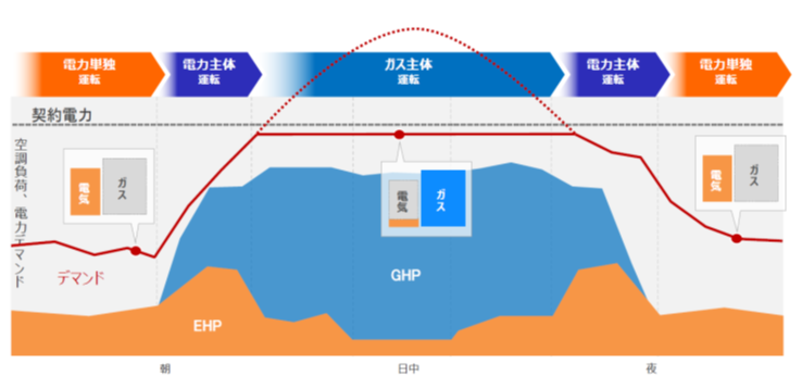 空調機は室内と室外の温度に応じて運転時にかかる負荷が変動します。低負荷時の運転に適したEHPと高負荷時の運転に適したGHPの違いを活かし、運転負荷に応じて自動で使い分けて運転効率が向上するハイブリッド運転を行います。この運転制御を東京ガス株式会社、大阪ガス株式会社、東邦ガス株式会社の各社が提供する遠隔制御サービスと連動させることで、エネルギーの料金メニューや今現在のエネルギー需給状況考慮した運転を可能にし、施設ごとに最適な空調機の運転を省エネかつ省コストで実現します。