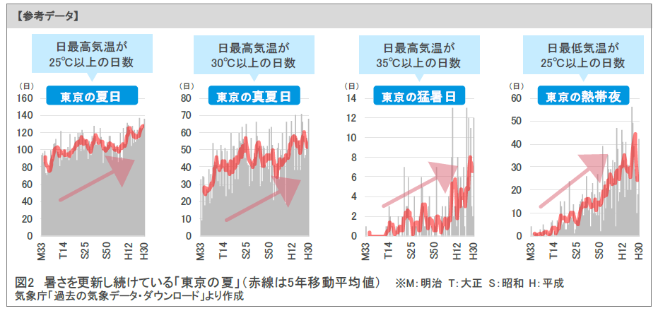 それでは、東京の夏の気温は実際に上がっているのでしょうか。東京の夏日(日最高気温が25℃以上)、真夏日(日最高気温が30℃以上)、猛暑日(日最高気温が35℃以上)、熱帯夜1(日最低気温が25℃以上)の日数の経年変化を見ると、いずれも右肩上がりで、東京は過去に経験したことのない夏の暑さを今なお更新し続けていることが分かります(図2)。