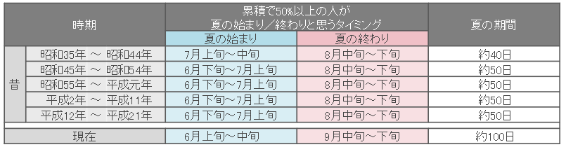 表1 東京の夏の始まり/夏の終わりのタイミング