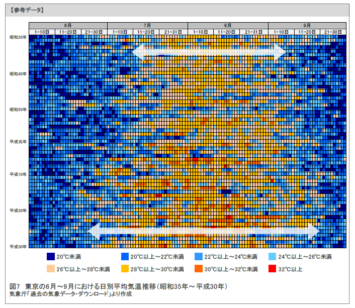 昭和・平成と比べて体感で約50日長くなった東京の夏ですが、夏の期間と感じている6月~9月は、実際に暑く、そして長くなっているのでしょうか。縦軸に年(昭和35年~平成30年)、横軸に日(6月1日~9月30日)をとって平均気温の推移を見ると、時代が進むほど(下に行くほど)平均気温が高いことを示す黄色やオレンジ、赤の四角が増え、それと同時にその範囲が左右に広がっていくことが分かります(図7)。つまり、東京の夏は体感だけでなく、平均気温の推移から見ても、年々暑く、その期間はじわじわと長くなっているといえます。