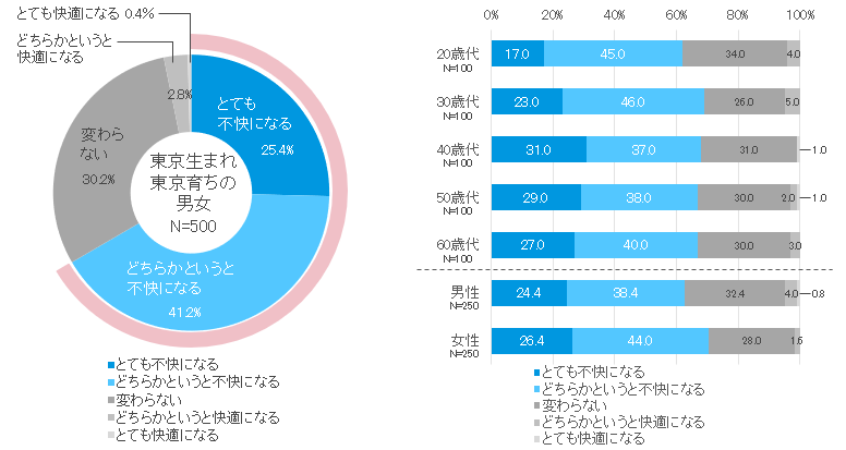 気温、湿度(しつど)が高く、長期化傾向にある東京の夏ですが、平成の猛暑を経た令和の夏はどうなっていくのでしょうか。「あなたは、令和の東京の夏の空気はどうなっていくと思いますか」と聞いたところ、「とても不快になる」(25.4%)、「どちらかというと不快になる」(41.2%)で、合わせて約7割(66.6%)の人が、令和の東京の夏が「不快になる」と考えていることが分かりました(図8)。東京生まれ・東京育ちの人は、東京の厳しい夏が今後も続くことをすでに覚悟しているのかもしれません。