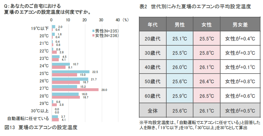 つけっぱなしという、新しいエアコンの使い方が広がる一方で、最も基本的な使い方といえる温度設定は現在どうなっているのでしょうか。「あなたのご自宅における夏場のエアコンの設定温度は何度ですか」と聞いたところ、男性は25℃(22.5%)、女性は27℃(28.0%)が最多となりました(図13)。なお、世代別に平均設定温度を算出すると、全ての世代で女性の方が高くなっていました(表2)。
