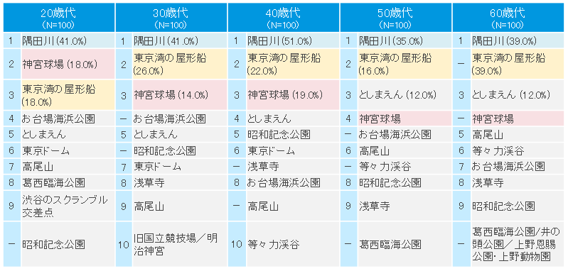 東京にはさまざまな観光スポットがあり、国内外から多くの観光客が訪れますが、東京生まれ・東京育ちの東京人にとって東京の夏を感じるスポットといえばどこなのでしょうか。「あなたは、東京の夏を感じたり、思い浮かべたりするスポットといえばどこだと思いますか」と聞いたところ、全ての世代で1位に挙げられたのは「隅田川」で、「東京湾の屋形船」、「神宮球場」が続きます(表3)。東京というと、都市のイメージが強くありますが、夏を感じるスポットとしては、隅田川花火大会や神宮外苑花火大会などの伝統的な花火大会が開催される場所や水辺のアクティビティを楽しめる場所などが人気と言えそうです。