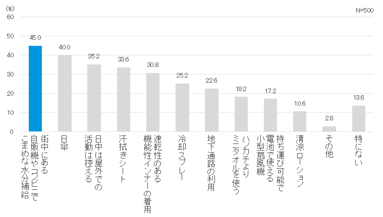 近年の東京の夏は、東京生まれ・東京育ちの人にとっても厳しい季節です。そこで、「令和に東京を訪れる外国人旅行者に向けて、東京の夏を快適に過ごす、おすすめの暑さ対策やグッズがあれば教えてください」と聞いたところ、最も多かったのは「街中にある自販機やコンビニでこまめな水分補給」(45.0%)で、次いで「日傘」(40.0%)、「日中は屋外での活動は控える」(35.2%)、「汗拭きシート」(33.6%)、「速乾性のある機能性インナーの着用」(30.8%)などのグッズが続きます(図14)。日本は世界有数のコンビニ大国、自販機大国であり、また日傘は世界でも珍しい暑さ対策グッズだと言われており、外国人旅行者におすすめする東京の暑さ対策の上位には日本ならではの対策が挙げられました。