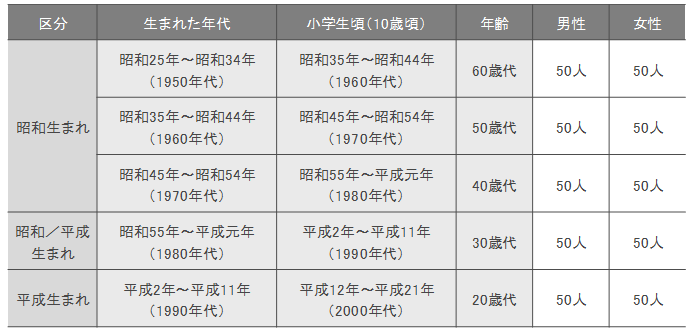 東京生まれ・東京育ちの男女500人に聞いた「令和元年 東京の夏の空気感調査」は、世代毎に、現在と小学生頃(10歳頃)について聞くことで、東京の空気感の変遷を調べた調査です。