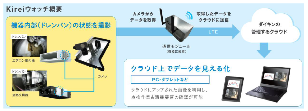 ダイキン工業株式会社は、業務用空調機の室内ユニット内にあるドレンパンの汚れ度合いを定点カメラの画像から自動解析し、パソコンやタブレット端末を通じて清掃の推奨時期※1を通知する、IoTを活用した業界初※2のサービス『Kireiウォッチ』を2019年10月1日から発売します。