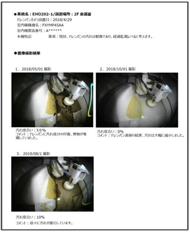 本サービスは、室内ユニット※3内に設置した定点カメラがドレンパンを自動で撮影し、当社独自のアルゴリズムによる画像解析で汚れ度合いを判定するものです。判定結果とあわせて清掃の推奨時期がパソコンやタブレット端末に通知されるため、現地での目視点検をすることなく清掃スケジュールの策定が可能です。また、ドレンパンの画像や汚れ度合いなど、クラウド上に蓄積した過去10年分※4のデータをいつでも閲覧でき、管理台帳や報告資料への活用が可能です。ドレンパン点検の実施に伴う工数の大幅な削減により、設備管理業者への負担軽減に貢献します。