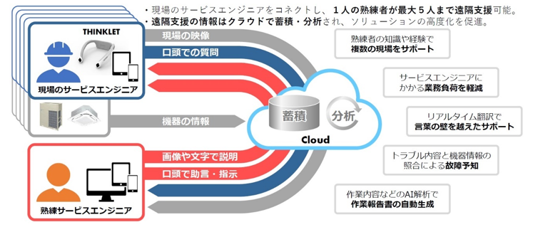 『THINKLETTM』を装着した作業者が遠隔地の熟練者の的確な指導や助言を得られる業務支援Webアプリを開発し、経験の浅いサービスエンジニアでも作業フローや使用部材※6の管理方法、環境負荷低減のための冷媒量管理方法、故障診断のポイントなどを迅速かつ的確に把握でき、高効率で高品質な作業を実現できる遠隔作業支援ソリューションを構築します。2020年8月の日本国内での本格展開に続いてグローバルへも順次展開し、まず国内では慢性的な人手不足に加えて大型イベント実施の影響等での渋滞による移動困難も予想される夏のサービスエンジニア不足に対応します。
