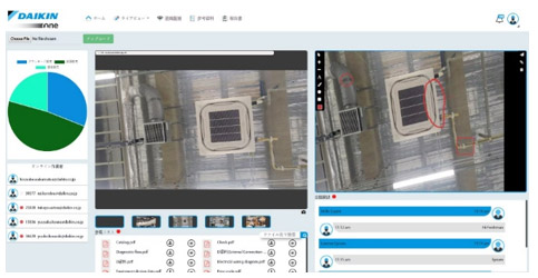 業務支援Webアプリは、ダイキン工業が培ってきた空調機のサービス業務の知見を活かして開発した、熟達したサービスエンジニアが支援者となり『THINKLETTM』やパソコンなどを用いて遠隔地で作業する最大5名のサービスエンジニアを同時に支援できるGUI※7です。現場での作業内容や、遠隔から支援した内容をもとに蓄積した作業履歴の確認も可能です。