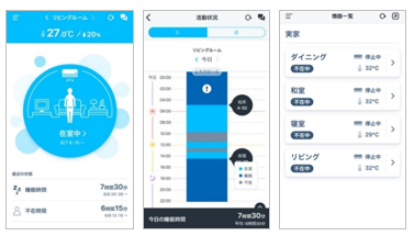 本商品は、動きに反応するドップラーセンサーにより、室内の人の在否や就寝・起床の状況を検知・解析します。こうした情報は約10分ごとに更新され、離れた場所からでも専用のスマートフォンアプリで確認できるため、単身高齢者の生活リズムの変化を把握できます。また、当社のルームエアコン※1との連携により、人の在室時に室温が高くなれば自動で冷房運転を開始し、就寝を検知すれば睡眠に適した運転に自動で切り替えます。こういった機能が搭載されていない機種でも、室温の変化に気付きづらい高齢者の暑さ対策や快眠の補助に活用できます。