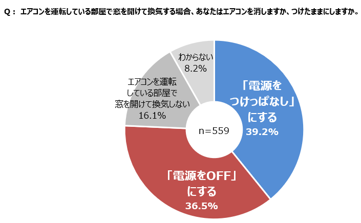 エアコンは熱中症の危険性がある夏の暑さ対策として欠かせないものですが、換気時の運転はどうしているのでしょうか。「エアコンを運転している部屋で窓を開けて換気する場合、あなたはエアコンを消しますか、つけたままにしますか」という質問に対して、「電源をつけっぱなし」にするつけっぱなし派は39.2%、「電源をOFF」にする一時停止派は36.5%でほぼ同じ割合となりました。エアコンは電源を入れた時に最も電力を消費するため、一般的に推奨されている1時間に5~10分程度の換気であれば、つけっぱなしにしておいた方が省エネになると考えられます。約4割の一時停止派は余計な電力を使ってしまっている可能性があります。