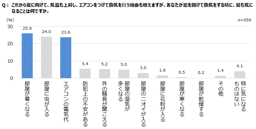 これから夏に向けて、気温も上昇し、エアコンをつけたまま換気を行う機会も増えますが、「あなたが窓を開けて換気する時に、最も気になることは何ですか」という質問に対して一番多かったのは「部屋が暑くなる」(25.9%)で、「部屋に虫が入る」(24.0%)、「エアコンの電気代」(23.6%)が後に続きます。