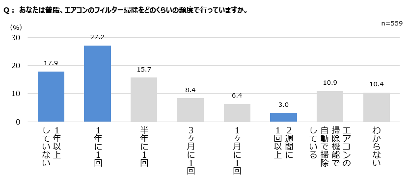 それではエアコンの節電に大きな効果があるフィルターの掃除はどのくらいの頻度でされているのでしょうか。「あなたは普段、エアコンのフィルター掃除をどのくらいの頻度で行っていますか」という質問に対して最も多かったのは「1年に1回」(27.2%)で、省エネ対策として推奨されている「2週間に1回以上」のフィルター掃除をしている人はわずか3.0%しかいませんでした。また、「1年以上していない(=1年に1回未満)」人は17.9%にのぼりました。フィルター掃除を1年間しないと、エアコンの消費電力が約25%も増加するという調査結果もあり、フィルター掃除による夏場のエアコン運転の改善余地はまだあるといえそうです。