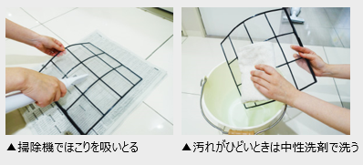フィルターのほこりは、掃除機で丁寧に吸いとります。汚れがひどいときには、中性洗剤をとかしたぬるま湯で洗い、その後、日陰でよく乾かしましょう。