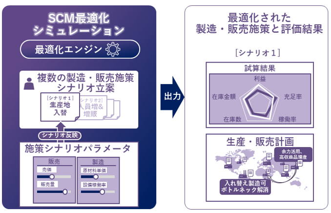 重要業績指標(KPI)最大化に向けて適正化した製造・販売施策シナリオや生産計画を自動で複数パターン提示し、意思決定の迅速化を実現、ウィズ・アフターコロナ時代の急激な需要変化にも対応