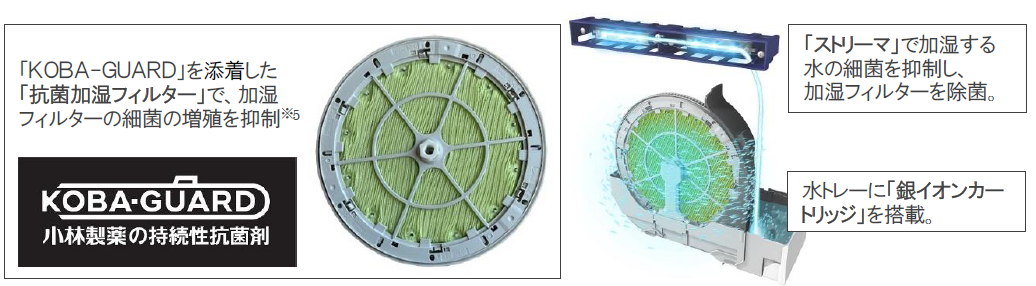 こうした背景の中、当社は、潜水艦内の細菌の増殖を抑制するために開発された抗菌技術を業界で初めて※2空気清浄機に応用した「抗菌加湿フィルター」を開発し、従来からの「ストリーマ」や「銀イオンカートリッジ」と組み合わせた、より清潔な加湿運転を追求しました。さらに、『うるるとさらら空気清浄機』『加湿ストリーマ空気清浄機(ハイグレードタイプ)』にのみ採用していた「TAFUフィルター」を『加湿ストリーマ空気清浄機(スリムタワータイプ)』『ストリーマ空気清浄機(コンパクトタイプ)』にも搭載することで、従来のHEPAフィルターと比較し、10年使用後の集塵効率を約1.4倍※3にアップさせました。また、『業務用ストリーマ空気清浄機』には、0.3μmの微小粒子を99.97%※4捕集する性能を持つ「静電HEPAフィルター」を採用しました。