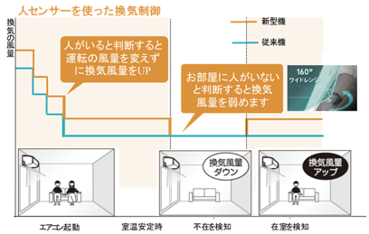 室内機のセンサーが人の在室を検知すると、室内機のファンの風量を変えずに室外機の換気ファンの風量を上げ、換気量を約10%増加する「センサー換気」を搭載しました。また、昨年11月に発売したIAQセンサー・AIコントローラー『Beside』により検知したCO2濃度に応じて自動的※7に換気運転することも可能です。