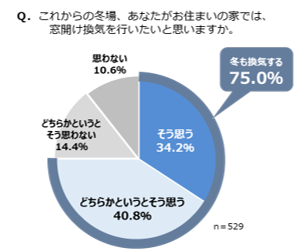 「これからの冬場、あなたがお住まいの家では窓開け換気を行いたいと思いますか」という質問に対して、「そう思う」34.2%、「どちらかというとそう思う」40.8%と、「冬も換気をしたい」と思っている人が75.0%と、4人に3人が窓開け換気をしたいと回答しました。