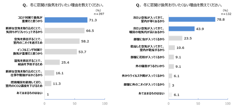 また、「冬に家で窓開け換気を行いたい」人の7割以上が「コロナ対策で換気が需要だと思うから」を挙げており、感染予防対策として換気に対する関心は依然として高いことがわかります。一方で、「冬に家で窓開け換気をしたくない」という人の約8割が「寒くなる」、約4割が「暖房の電気代が高くなる」ことを理由に挙げていました。