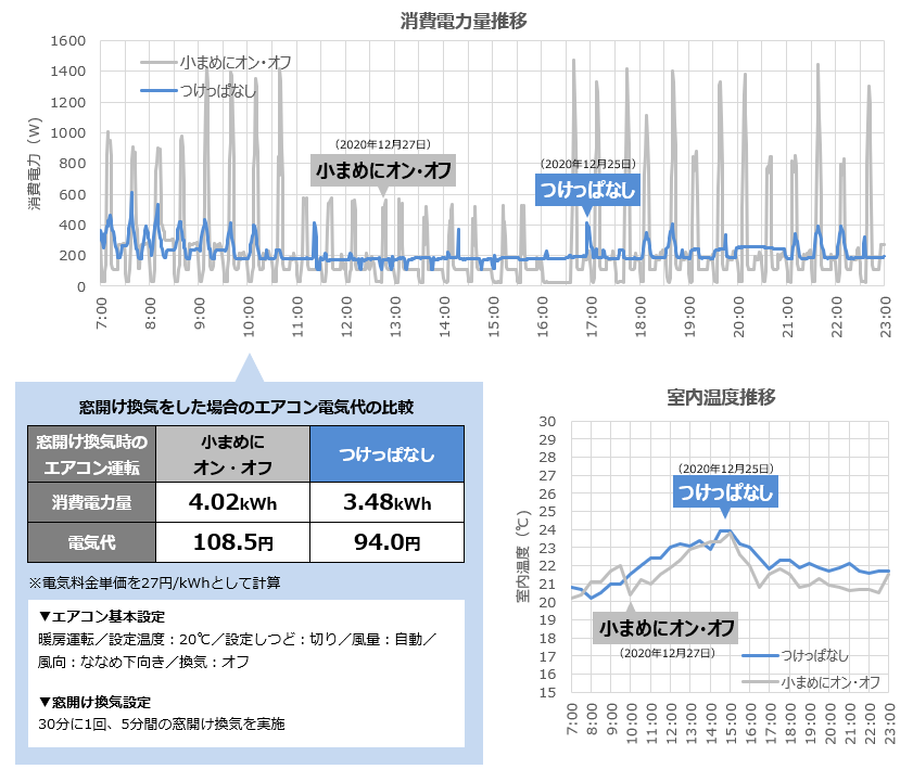 | 結果 | 冬に窓開け換気をする場合、エアコンをつけっぱなしにした方が、小まめにオン・オフするより消費電力量が少なくなり、電気代が1日で約14.5円下がりました。 |