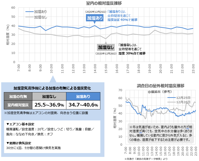 | 結果 | 冬に窓開け換気をする場合、「加湿なし」では湿度30%台の時間帯が続くのに対し、「加湿あり」では湿度40%にほぼ保たれました。 |