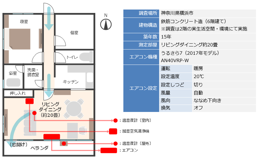 コロナ禍において“新しい生活様式”として換気が求められており、空気が冷たく、乾燥しがちな冬は、夏以上に上手な換気の方法を知っておくことが重要です。冬に窓開け換気をすると、屋外の冷たい空気が入りエアコンの電気代や部屋の温度と湿度の低下が気になるという方も多いと思います。そこで、全国的に冬の寒さが本格化するなか「冬に窓開け換気をする場合、エアコンの運転はどうしたらいいの?」をテーマに、マンションの広めのリビングを使った実生活空間で、2つの調査をしました。1つ目に、窓開け換気に合わせてエアコンの電源を小まめにオン・オフした場合とつけっぱなしにした場合ではどちらの消費電力量が少ないのか、2つ目に、窓開け換気時の加湿の有無が、室内の湿度にどれほどの影響を与えるのかについて調査し結果をまとめました。
