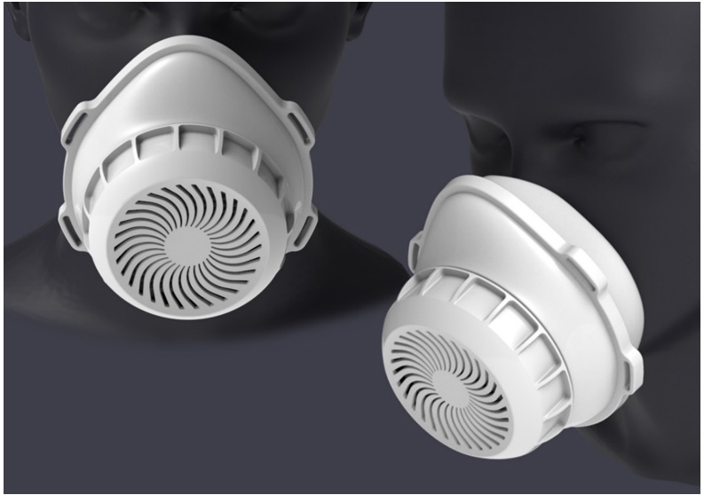 開発チームによる共同開発の結果、N95相当の医療用高性能マスクの量産試作モデルの仕様が確定しました。ダイキン工業は息がしやすくかつ高性能のフィルター効果が持続する濾材(フィルターを構成する空気濾過用の材料)の開発に世界で初めて成功し、この濾材を用いてマスク用フィルターを製造しました。クロスエフェクトは上記フィルターをもとに、国循内のオープンイノベーションラボ(注2)を活用し、精密 3D プリンティングを応用した特有のRapid Prototype 技術(金型を使わずに迅速に試作品を製作する技術)を用いた試作を繰り返しました。N95規格を制定するNIOSHの規格に従いながら、マスクの機能性、デザイン性、小型化などの課題を解決し、洗練されたデザイン設計に至りました(図1)。ニプロは量産化を目指し、各部材の最適化設計を行いました。量産を考慮した部品等の考案や各部材の構造見直し、成型方法の検討を行い、生産・量産に適した設計及び量産体制の構築に至りました。