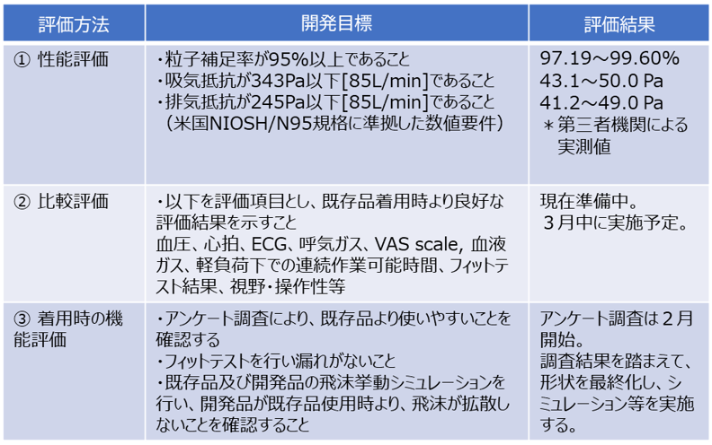 また、3月中に新規開発マスクを用いたボランティアによる心肺運動負荷(CPX)試験を実施します。ボランティア20名に新規開発マスク及び既存メーカー複数社のN95マスクを着用していただき、軽度の労作下における血圧、心電図、呼気ガス運動耐用能および連続作業可能時間等について評価を行うことで、新規開発マスクと既存品との比較を行います。